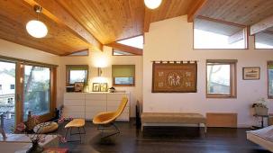 This apartment with nice shades of blue and a beautiful bathroom will help you to relax after work.